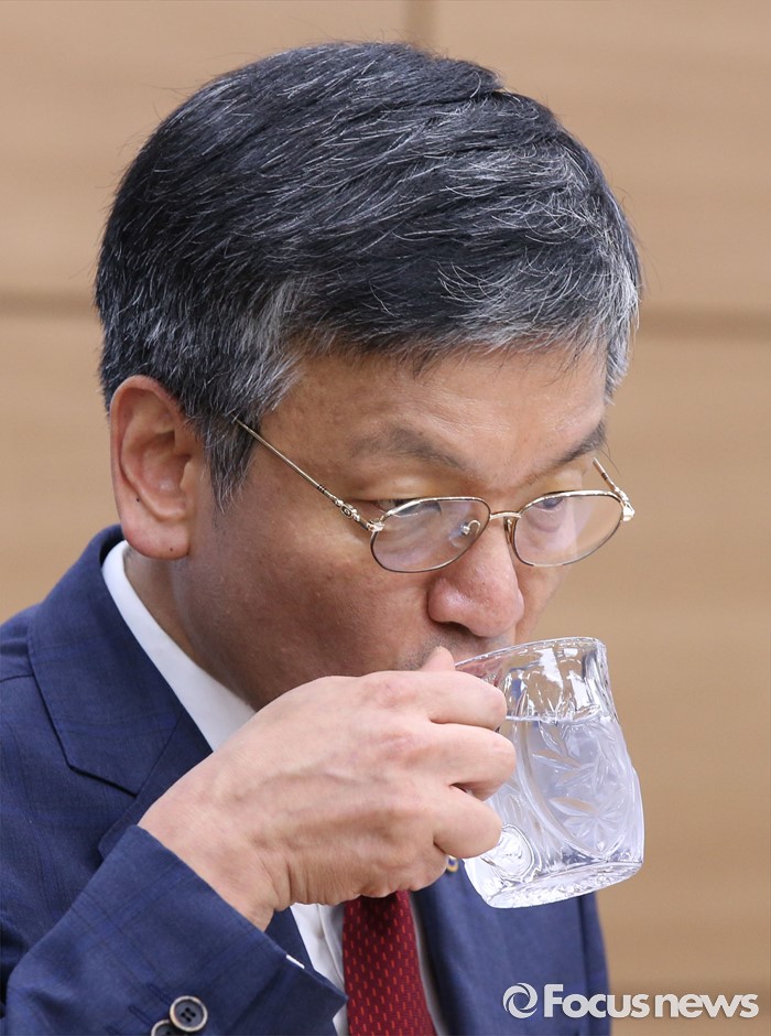 (세종=포커스뉴스) 최상목 기획재정부 제1차관이 지난 25일 오후 세종시정부세종청사 기재부 브리핑실에서 2016년 세법개정안 브리핑 중 목을 축이고 있다.