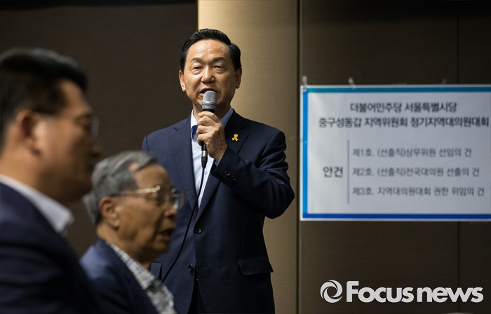 (서울=포커스뉴스) 더불어민주당 김상곤 전 혁신위원장이 28일 오후 서울 성동구 레노스블랑쉬 웨딩홀에서 열린 서울 중구·성동갑 지역대의원대회에서 발언하고 있다.