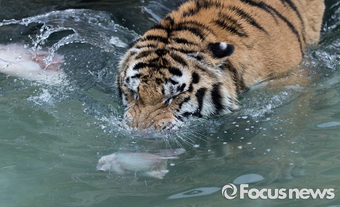 (과천=포커스뉴스) 28일 오후 경기도 과천 서울동물원에서 시베리아 호랑이가 얼린 닭고기를 먹으며 더위를 식히고 있다.