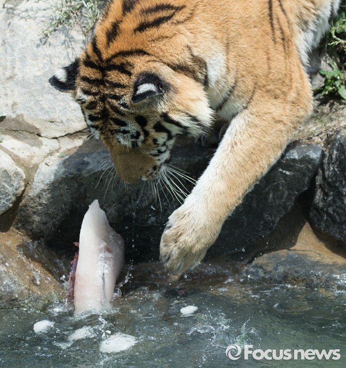 (과천=포커스뉴스) 28일 오후 경기도 과천 서울동물원에서 시베리아 호랑이가 얼린 닭고기를 먹으며 더위를 식히고 있다.