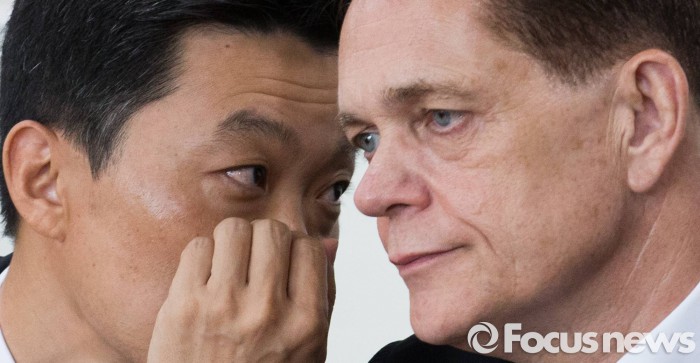 박 사장에 대한 구속여부는 29일 오전 열리는 구속 전 피의자심문(영장실질심사)을 거쳐 결정될 예정이다.(인천=포커스뉴스) 요하네스 타머(오른쪽) 아우디폭스바겐 사장과 정재균 부사장이 25일 오전 인천 서구 국립환경과학원에서 열린 차량 인증 조작 관련 환경부 청문회에 참석해 대화 나누고 있다. 2016.07.25 오장환 기자