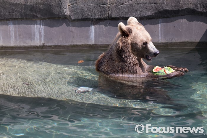 (과천=포커스뉴스) 28일 오후 경기도 과천 서울동물원에서 불곰이 얼음과일을 먹고 있다.