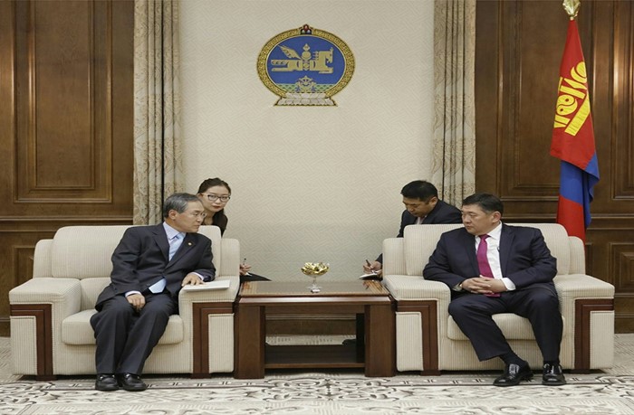 (서울=포커스뉴스) 몽골 국회 사무총장의 공식 초청으로 몽골을 방문 중인 우윤근(왼쪽) 국회 사무총장이 28일 몽골 국회를 방문해 몽골 엥흐볼드(Miyagombo ENKHBOLD) 국회의장과 면담을 하고 있다. <사진제공=국회사무처>