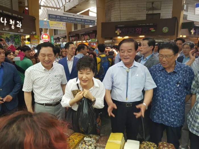 그러면서 "울산 방문이 앞으로의 경제난을 해소하고 원만한 국정운영의 계기가 되길 진심으로 희망한다"고도 말했다.휴가 중인 박근혜 대통령이 28일 울산 신정시장을 방문, 상인과 대화를 나누고 있다. <사진출처=정갑윤 새누리당 의원 페이스북>