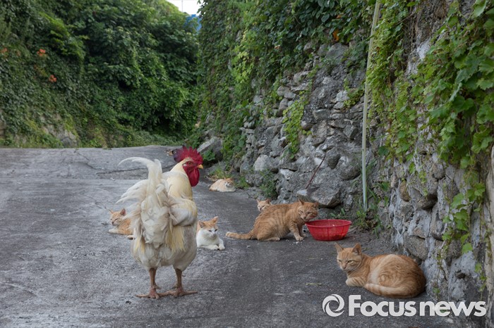 (여서도=포커스뉴스) 길냥이 천국 여서도에서 수탉이 고양이가 먹고 있는 음식찌꺼기를빼앗으러 접근하고 있다.