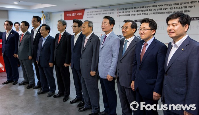 (서울=포커스뉴스) 김희옥(왼쪽 다섯 번째) 새누리당 혁신비상대책위원장과 정진석(왼쪽 세 번째) 원내대표를 비롯한 새누리당 전당대회 당대표 후보 및 지도부들이 9일 오전 서울 여의도 새누리당사에서 열린 '4차 전당대회 혁신과 화합의 선거 서약식'에 참석해 사진촬영을 하고 있다. 왼쪽부터 박명재 사무총장, 주호영, 정진석 원내대표, 이주영, 김희옥 혁신비상대책위원장, 정병국, 박관용 선거관리위원장, 한선교, 이정현, 김용태, 지상욱 대변인.