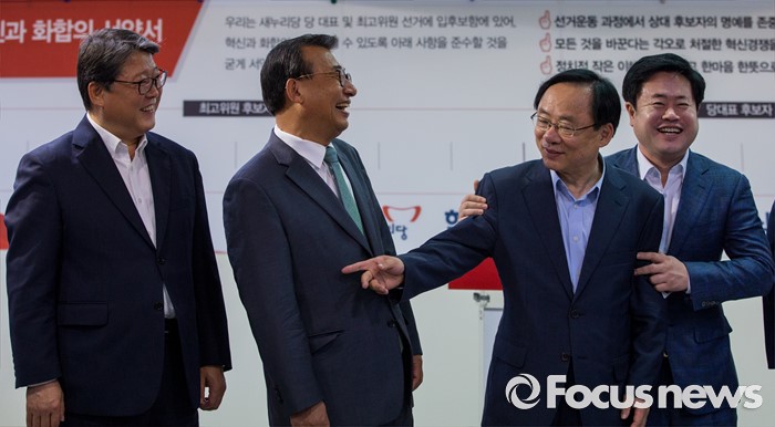 (서울=포커스뉴스) 이주영(오른쪽 두 번째) 새누리당 의원과 조원진(왼쪽) 의원이 9일 오전 서울 여의도 새누리당사에서 열린 '4차 전당대회 혁신과 화합의 선거 서약식'에 참석해 대화 하고 있다.