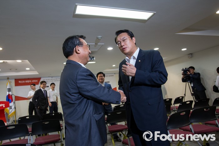 (서울=포커스뉴스) 정진석(오른쪽) 새누리당 원내대표와 이정현 의원이 9일 오전 서울 여의도 새누리당사에서 열린 '4차 전당대회 혁신과 화합의 선거 서약식'에 참석해 대화 하고 있다.