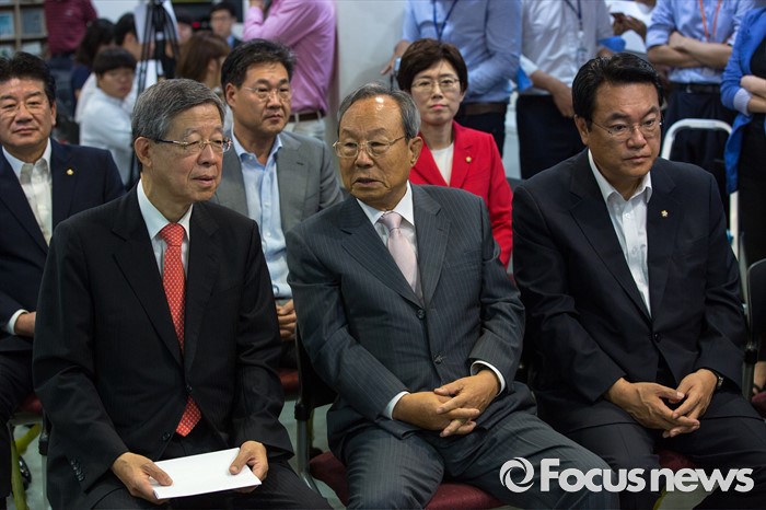 (서울=포커스뉴스) 김희옥(왼쪽) 새누리당 혁신비상대책위원장과 박관용 선거관리위원장이 9일 오전 서울 여의도 새누리당사에서 열린 '4차 전당대회 혁신과 화합의 선거 서약식'에 참석해 대화 하고 있다.