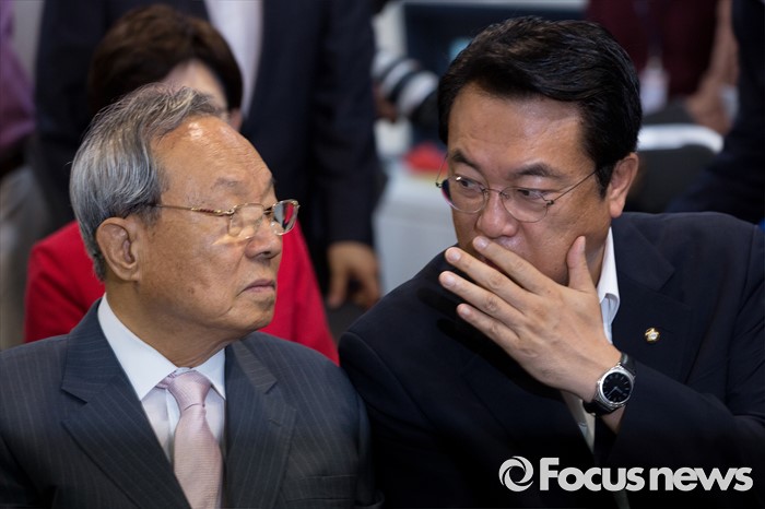 (서울=포커스뉴스) 정진석(오른쪽) 새누리당 원내대표와 박관용 선거관리위원장이 9일 오전 서울 여의도 새누리당사에서 열린 '4차 전당대회 혁신과 화합의 선거 서약식'에 참석해 대화 하고 있다.