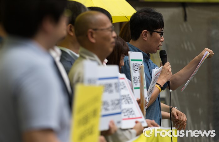 (서울=포커스뉴스) 29일 오후 서울 광화문광장에서 세월호특조위 진상규명활동 보장 촉구 기자회견에 참석한 참여연대 관계자가 기자회견문을 낭독하고 있다.