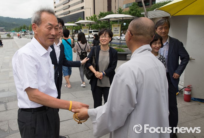(서울=포커스뉴스) 이석태 세월호참사 특별조사위원회 위원장이 29일 오후 서울 광화문광장에서 열린 세월호특조위 진상규명활동 보장 촉구 기자회견이 끝난 후 참여연대 관계자들과 인사하고 있다.