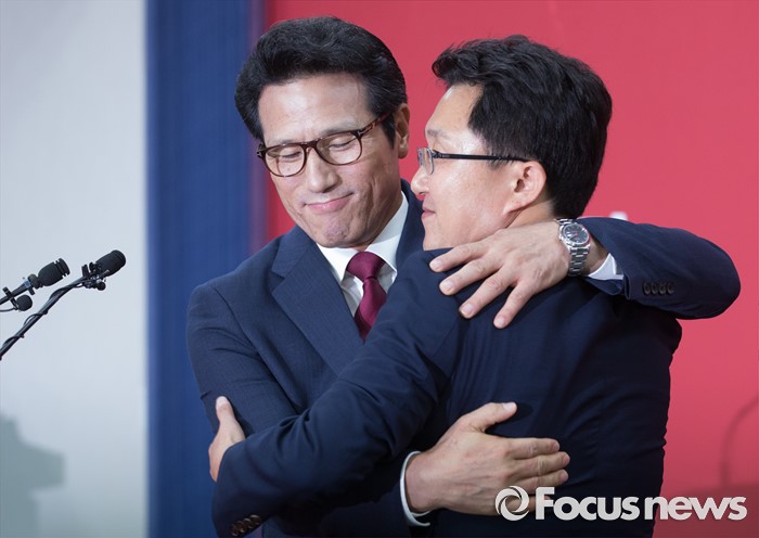 (서울=포커스뉴스) 전당대회 대표최고위원 출마를 선언한 정병국(왼쪽), 김용태 새누리당 의원이 29일 오후 서울 여의도 당사에서 단일화 발표 기자회견 중 포옹하고 있다. 이날 두 의원은 여론조사를 통해 정병국 의원으로 단일화를 결정했다.