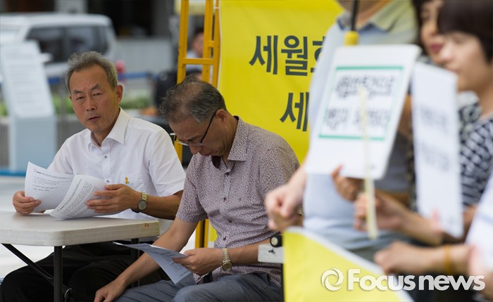 (서울=포커스뉴스) 이석태 세월호참사 특별조사위원회 위원장이 29일 오후 서울 광화문광장에서 열린 세월호특조위 진상규명활동 보장 촉구 기자회견을 바라보고 있다.