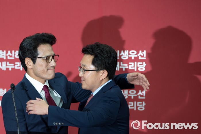(서울=포커스뉴스) 새누리당 전당대회 대표최고위원 출마를 선언한 정병국(왼쪽), 김용태 의원이 29일 오후 서울 여의도 당사에서 단일화 발표 기자회견 중 포옹하고 있다. 이날 두 의원은 여론조사를 통해 정병국 의원으로 단일화를 결정했다.