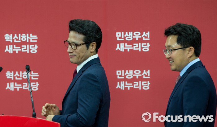(서울=포커스뉴스) 새누리당 전당대회 대표최고위원 출마를 선언한 정병국(왼쪽), 김용태 의원이 29일 오후 서울 여의도 당사에서 단일화 발표 기자회견을 하기 위해 브리핑실로 들어서고 있다. 이날 두 의원은 여론조사를 통해 정병국 의원으로 단일화를 결정했다.