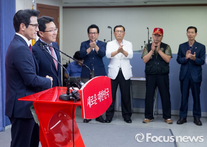 (서울=포커스뉴스) 전당대회 대표최고위원 출마를 선언한 정병국(왼쪽), 김용태 새누리당 의원이 29일 오후 서울 여의도 당사에서 단일화 발표 기자회견을 마친 뒤 취재진을 향해 포즈를 취하고 있다. 이날 두 의원은 여론조사를 통해 정병국 의원으로 단일화를 결정했다.