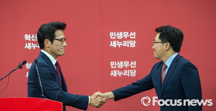(서울=포커스뉴스) 새누리당 전당대회 대표최고위원 출마를 선언한 정병국(왼쪽), 김용태 의원이 29일 오후 서울 여의도 당사에서 단일화 발표 기자회견을 마친 뒤 악수 하고 있다. 이날 두 의원은 여론조사를 통해 정병국 의원으로 단일화를 결정했다.
