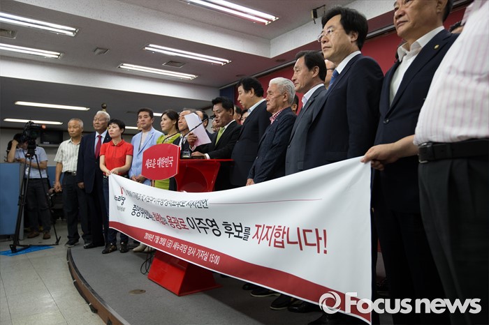 (서울=포커스뉴스) 새누리당 중앙위원회 관계자들이 29일 오후 서울 여의도 새누리당사 브리핑실에서 전당대회 당대표에 출마한 이주영 의원을 공개 지지 선언 하고 있다.