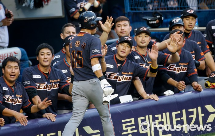 (서울=포커스뉴스) 26일 서울 잠실구장에서 열린 2016 프로야구 한화-두산 경기에서 1회초 한화 이용규가 선취점을 올린 후 동료들과 손뺙을 마주치고 있다.