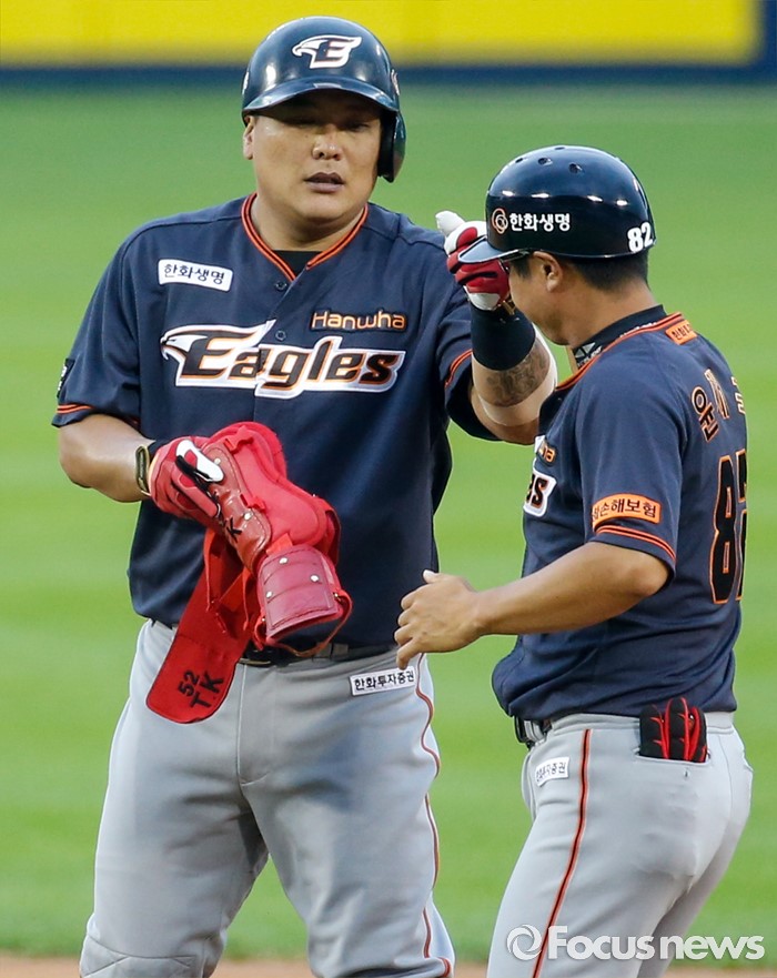 (서울=포커스뉴스) 26일 서울 잠실구장에서 열린 2016 프로야구 한화-두산 경기에서 1회초 한화 김태균이 선취 2타점 2루타를 친 후윤재국 코치와 손을 마주치고 있다.
