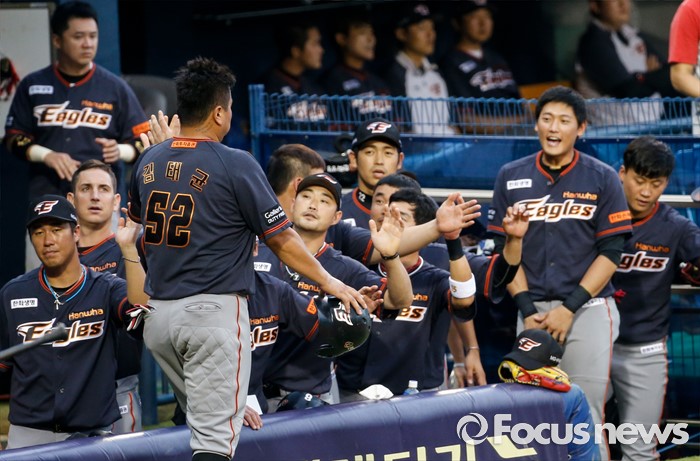 (서울=포커스뉴스) 26일 서울 잠실구장에서 열린 2016 프로야구 한화-두산 경기에서 1회초 한화 김태균이 홈을 밟은 후 동료들과 손뼉을 마주치고 있다.