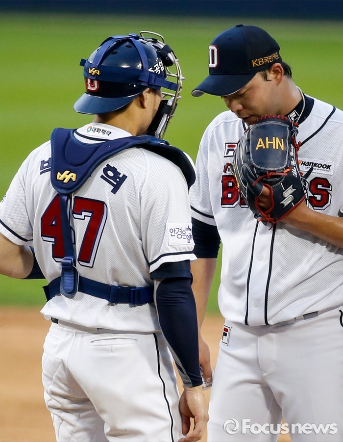 (서울=포커스뉴스) 26일 서울 잠실구장에서 열린 2016 프로야구 한화-두산 경기에서 1회초 두산 선발투수 안규영이 3실점 후 포수 박세혁과 대화하고 있다.