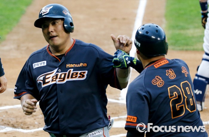김태균은 3-8로 뒤진 7회초 2사 1·2루에서 김태균이 바뀐 투수 정재훈을 상대로 좌측 담장을 넘기는 3점 홈런을 쏘아올리며 추격의 발판을 마련했다.(서울=포커스뉴스) 26일 서울 잠실구장에서 열린 2016 프로야구 한화-두산 경기에서 1회초 한화 김태균이 홈을 밟은 후 양성우와 손뼉을 마주치고 있다. 2016.07.29 양지웅 기자