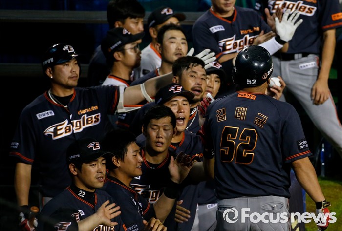 (서울=포커스뉴스) 26일 서울 잠실구장에서 열린 2016 프로야구 한화-두산 경기 7회초 2사 1,2루 상황에서 3점 홈런을 친 후 동료들과 손뼉을 마주치고 있다.