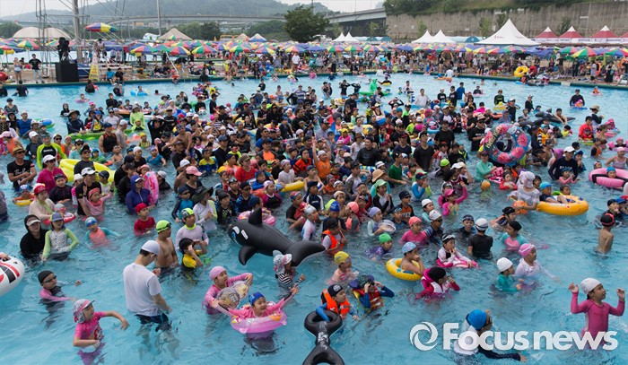 (서울=포커스뉴스) 30일 오전 서울 마포구 망원한강공원 수영장에서 열린 2016 난리부르스 풀 페스티벌을 찾은 시민들이 물놀이를 즐기고 있다.