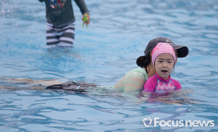 (서울=포커스뉴스) 30일 오전 서울 마포구 망원한강공원 수영장을 찾은 시민들이 물놀이를 즐기고 있다.