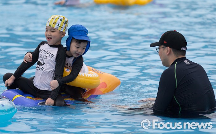 (서울=포커스뉴스) 30일 오전 서울 마포구 망원한강공원 수영장을 찾은 시민들이 물놀이를 즐기고 있다.