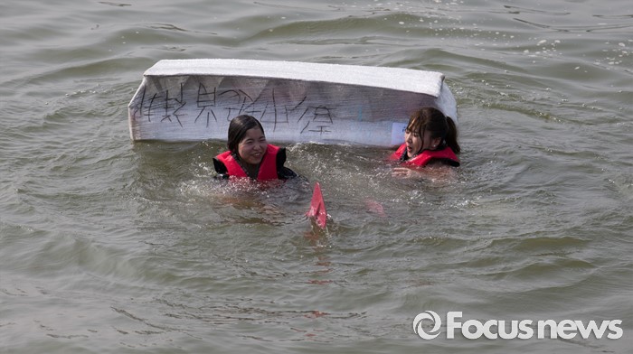 (서울=포커스뉴스) 30일 오후 서울 송파구 잠실한강공원에서 열린 한강 종이배 경주대회 '박스원레이스'에 참가한 시민들이 탄 배가 침몰하고 있다.