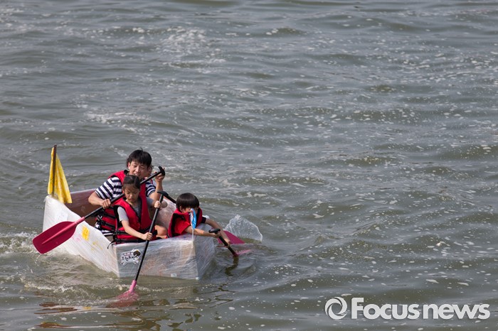 (서울=포커스뉴스) 30일 오후 서울 송파구 잠실한강공원에서 열린 한강 종이배 경주대회 '박스원레이스'에 참가한 시민들이 노를 젓고 있다.