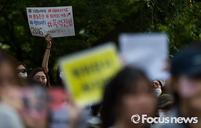 (서울=포커스뉴스) 30일 오후 서울 서대문구 이화여자대학교 본관 앞에서 고졸 출신 직장인 등을 위한 단과대 설립을 반대하는 학생들이 경찰의 폭력 진압 의혹 기자회견을 하고 있다. 이날 오후 경찰은 학교 측 요청으로 갇혀 있던 교수, 교직원을 데리고 나왔으며 이 과정에서 경찰과 재학생 간 충돌이 있었다.