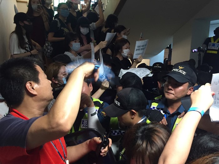 (서울=포커스뉴스) 30일 오후 서울 서대문구 이화여대 본관에서 경찰들이 고졸 출신 직장인 등을 위한 단과대 설립을 반대하는 학생들과 충돌하고 있다. <사진출처=이화여대 총학생회 공식 페이스북>