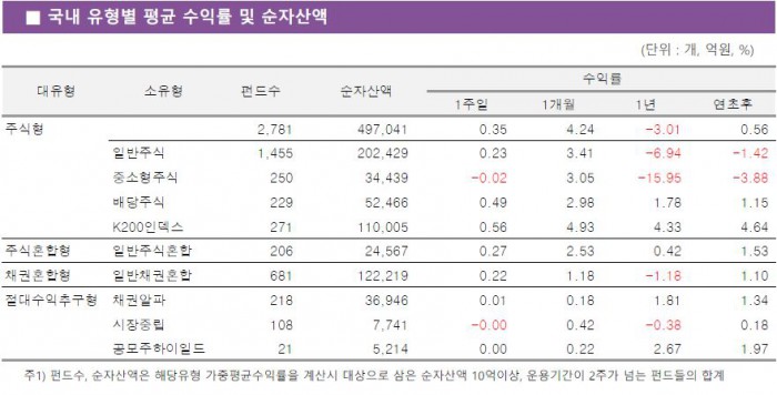 KOSPI200지수를 추적하는 K200인덱스펀드가 0.56%의 수익률로 국내 주식형펀드 중 가장 우수한 성과를 보였다. 배당주식펀드와 일반주식펀드도 각각 0.49%, 0.23% 상승했다. 반면 중소형주식펀드는 코스닥시장 약세 영향으로 0.02% 하락했다.