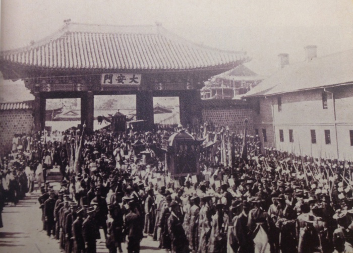 (서울=포커스뉴스) 1905년에 발간된 청한전시풍경사진첩에 등장한 대안문. 대안문으로 고종황제가 행차하는 사진인데, 일부 덧칠한 흔적은있지만, 대안문 편액이 민병석글씨인 것과대안문 너머로 공사중인 중화전 모습이 보이는 것으로 보아 1889년과 1902년 사이에 촬영한 것으로 추정된다.대안문 오른쪽 건물은 대한제국 원수부 건물이고, 신식군인들의 일사분란한 모습이 새디의 사진과는 대비 된다.