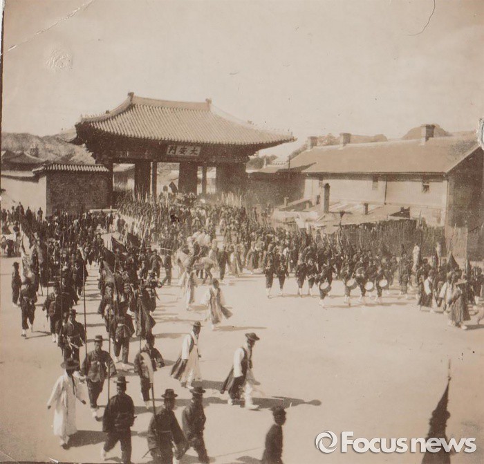 (서울=포커스뉴스)고종의 어가행렬이경운궁 대안문(지금의 대한문)을 나서고 있다.정확한 촬영날자는 알 수 없으나 , 대안문이 경운궁의 정문처럼 사용된 초기의 사진으로 추정된다. 이 사진은 미국인 새디가 담은 것으로 1904년 아서 웰번선교사에게 선물로 준 것이다.