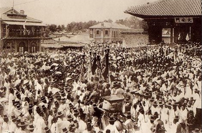 (서울=포커스뉴스) 아관파천이후 1887년 경운궁으로 환궁하는 고종어가 행렬. 대안문의 편액이 새디의사진과 일치한다. 새디는 대안문 왼쪽 프랑스식 레스토랑 2층 발코니에서 사진을 촬영한 것 같다.