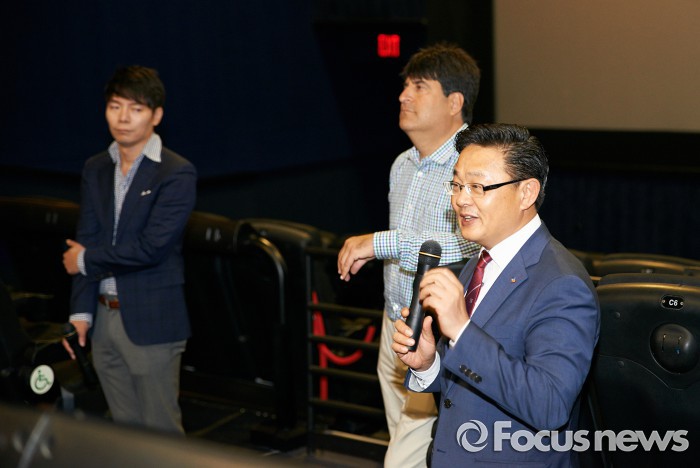4DX는 CJ CGV가 세계 최초로 상용화에 성공한 오감체험상영관이다. 영화 장면을 따라 의자가 움직이거나 진동이 발생하고, 물이 튀는가 하면 향기까지 나는 다양한 오감 효과를 제공한다. 4DX는 7월 말 기준 국내를 비롯해 중국·일본·미국·영국·러시아·멕시코 등 전 세계 41개국에 268개 상영관을 운영 중이다.지난 7월30일(현지 시간) 미국 로스앤젤레스에 위치한 리갈시네마 4DX 상영관 안에서 (왼쪽부터) 최현철 미국 CJ 4DPLEX 법인장, 마이클 미국 리갈시네마 홍보 총괄, 최병환 CJ 4DPLEX 대표가 취재진의 질문에 답변하고 있다.<사진제공=CJ그룹>