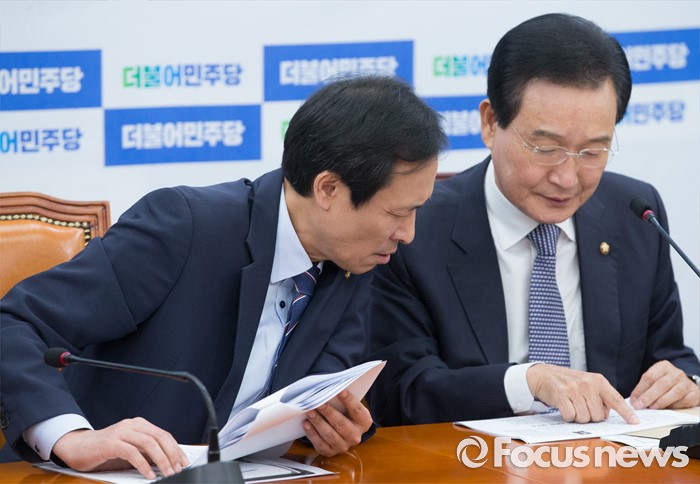 (서울=포커스뉴스) 1일 오전 서울 여의도 국회에서 열린 더불어민주당 원내대책회의에 참석한 우상호(왼쪽) 원내대표와 변재일 정책위의장이 대화하고 있다.