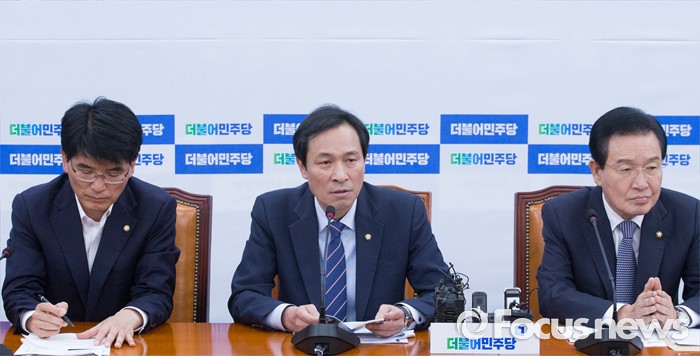 (서울=포커스뉴스) 1일 오전 서울 여의도 국회에서 열린 더불어민주당 원내대책회의에 참석한 우상호 원내대표가 모두발언을 하고 있다.