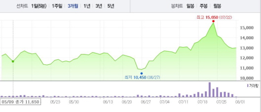 NEW는 1일 오전 9시39분 현재 전 거래일 대비 0.39%(50원) 상승한 1만3000원에 거래되고 있다.