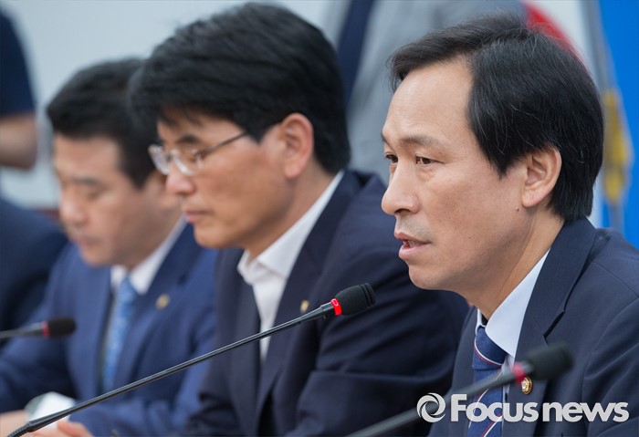 (서울=포커스뉴스) 1일 오전 서울 여의도 국회에서 열린 더불어민주당 원내대책회의에 참석한 우상호 원내대표가 모두발언을 하고 있다.