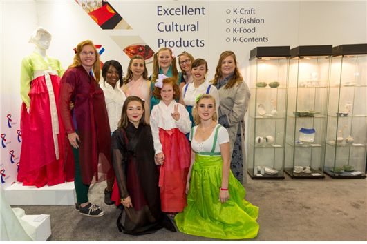 한복린의 '레이스거들 한복드레스', 담연의 '케이(K) 드레스' 등 한복과 바이러스 디자인 '울림독 시리즈', 가치있는공방 '한복접시세트', 안시성옹기 '모닝기세트', 초이도자공방 '꽃살 문양 다기 세트', 강진탐진청자 '청자 옻칠 연잎형 다기세트' 등의 공예품, '하림 삼계탕', '한성포기김치', '비비고 라이스' 등 식품 및 한식, 박시백의 '만화 조선왕조실록'의 문화콘텐츠 등이 K-리본(K-Ribbon) 마크를 달고 관람객에게 소개됐다.지난 7월29~31일 미국 LA 컨벤션 센터에서 열린 '케이콘 LA'에서 관람객들이 한복을 입고 기념사진 촬영을 하고 있다.<사진제공=문화체육관광부>
