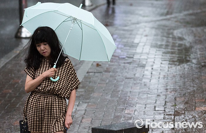 (서울=포커스뉴스) 천둥, 번개를 동반한 강한비가 내린 2일 오후 서울 서초구 교대역 주변에서 한 시민이 비를 피해 발걸음을 재촉하고 있다.