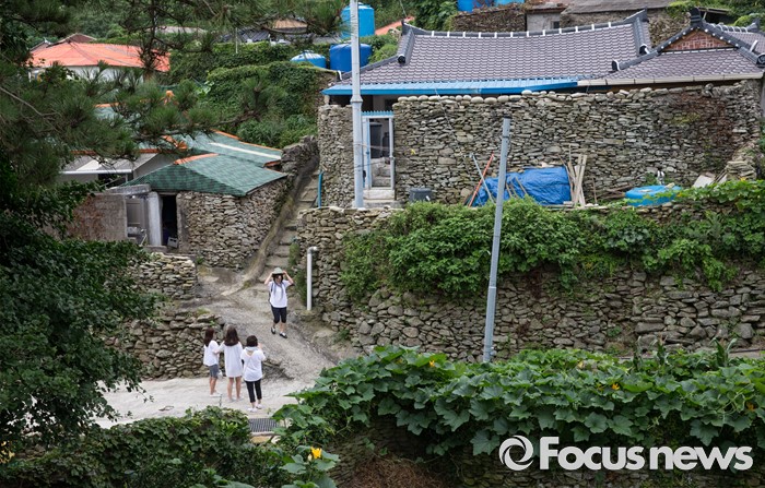 (여서도=포커스뉴스) 세월을 멈춘듯 한가한 여서도의 돌담 마을. 이따금 찾아오는 관광객들이 성곽같은 돌담을 배경으로 기념사진을 찍고 있다.
