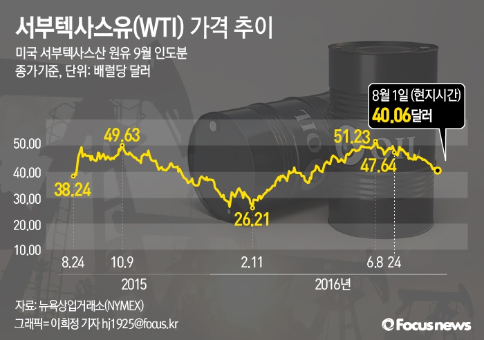 세계은행은 7월26일 올해 국제유가의 전망치를 배럴당 41달러에서 43달러로 상향 조정했다.(서울=포커스뉴스) 1일(현지시각) 뉴욕상업거래소에서 9월분 인도분 서부텍사스유(WTI) 가격은 전일대비 3.7% 급락한 40.06로 마감했다. 이는 올 4월 이후 최저치다. 2016.08.02 이희정 기자
