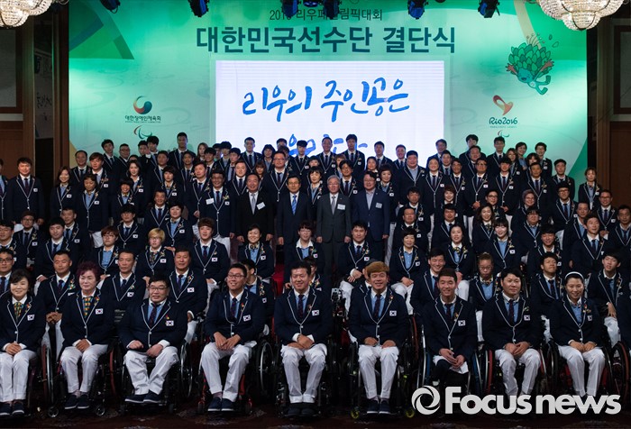 (서울=포커스뉴스) 2일 오후 서울 송파구 올림픽파크텔에서 열린 2016 리우 패럴림픽 대한민국 선수단 결단식에 자리한 황교안 국무총리를 비롯한 내빈들과 출전 선수단이 기념촬영 하고 있다.